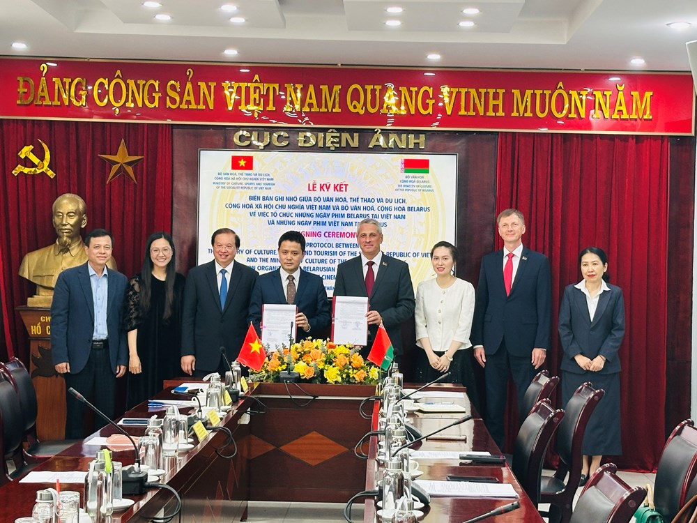 24.03.2026 г.24 сакавіка 2026 г. Надзвычайны і Паўнамоцны Пасол Рэспублікі Беларусь у Сацыялістычнай Рэспубліцы В'етнам Уладзімір Баравікоў ад імя і па даручэнні Міністэрства культуры Рэспублікі Беларусь разам з дырэктарам Дэпартамента кіно Міністэрства культуры, спорту і турызму Сацыялістычнай Рэспублікі В'етнам Данг Чан Кыонгам падпісаў міжведамасны Пратакол аб арганізацыі Дзён беларускага кіно ў В'етнаме і Дзён в'етнамскага кіно ў Беларусі.